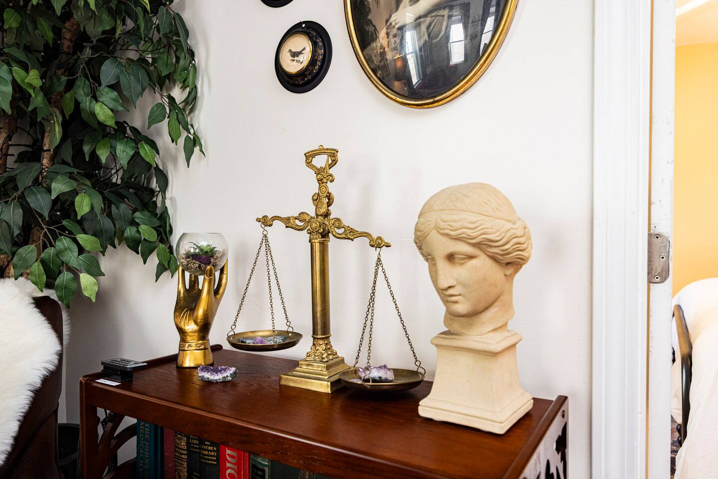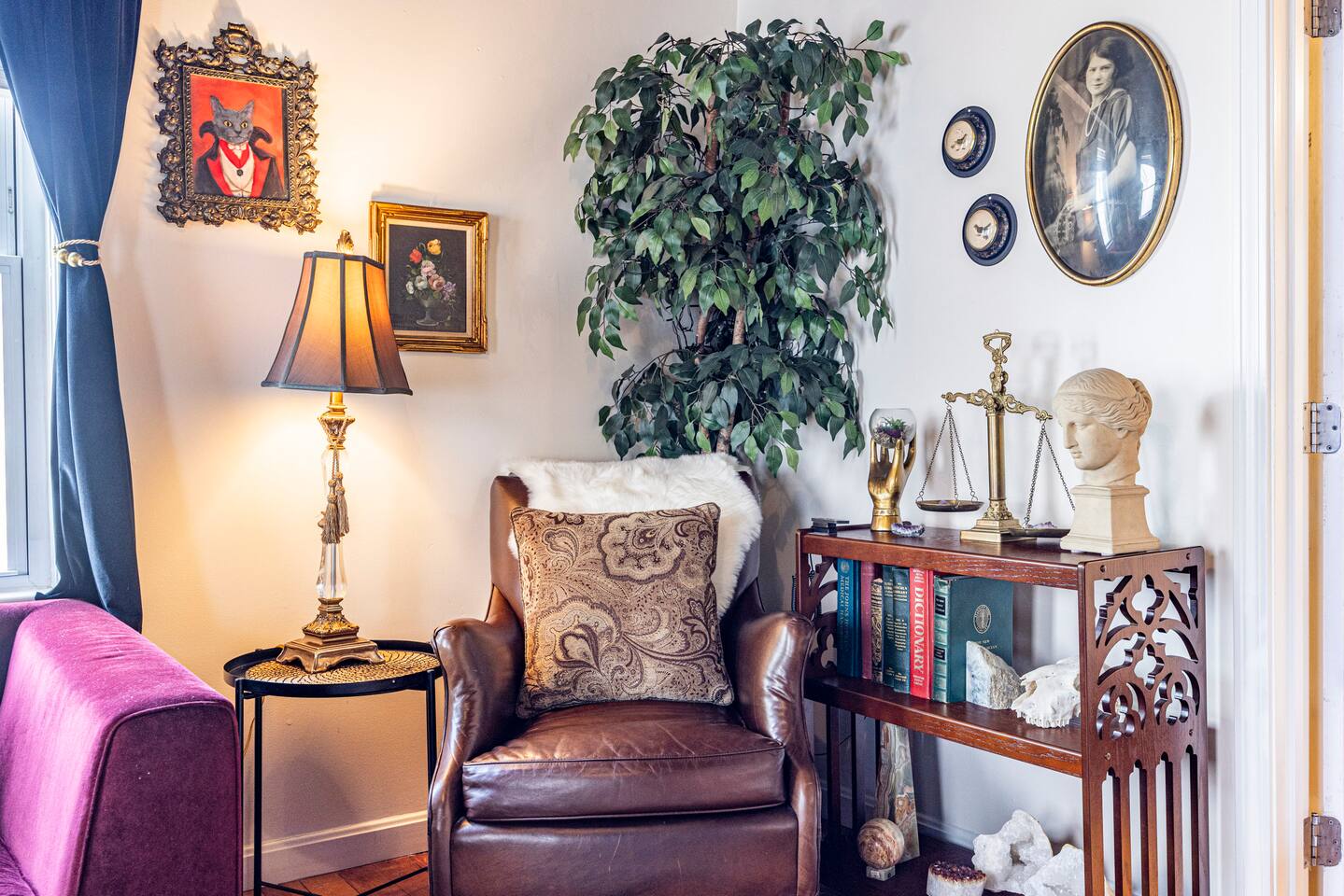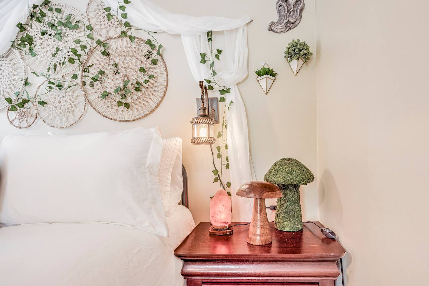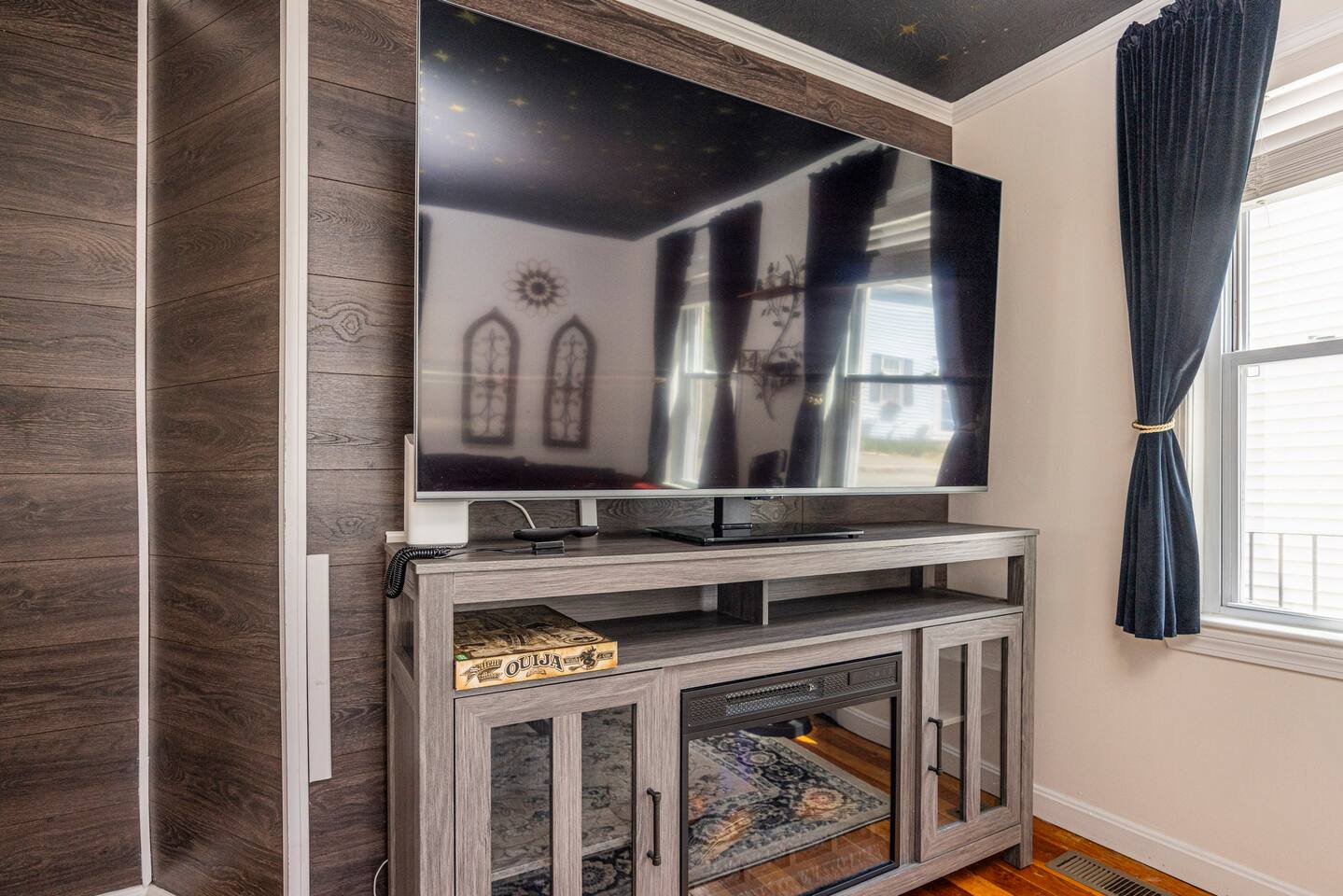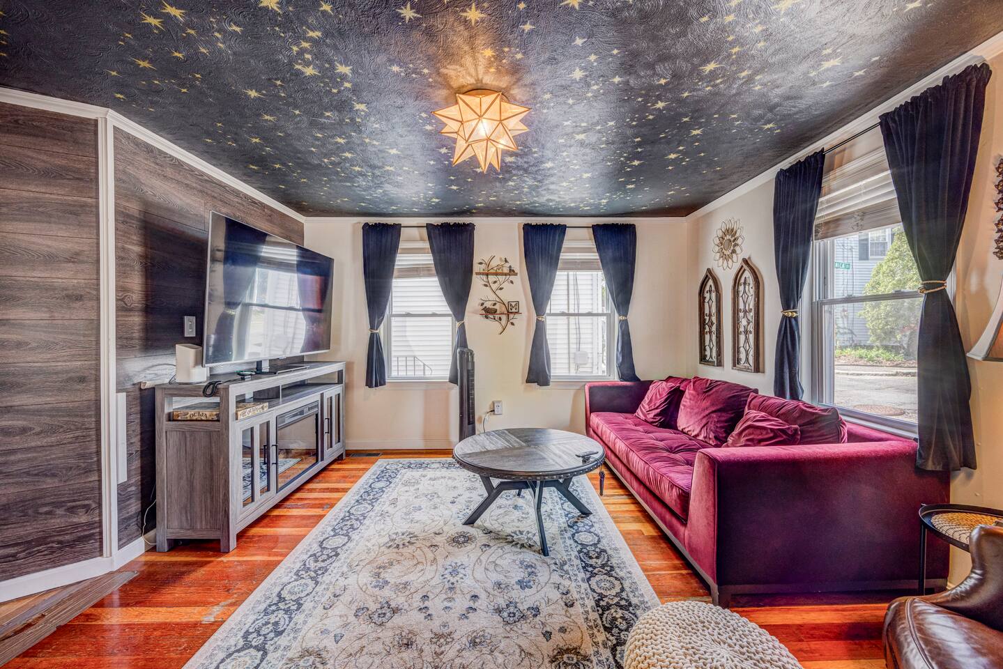 Our enchanted living room offers total relaxation under the starry sky, while enjoying a movie on our large screen TV by the cozy fireplace. Our two bedrooms feature top-of-the-line queen size mattresses where you can sleep-in late in total darkness or wake to morning sun with our adjustable darkening shade system. You can enjoy creating your own brews and stews in our fully applianced kitchen or explore our directory for best local eateries and taverns all within walking distance. We hope that you will enjoy staying here as much as we enjoyed creating our theme filled dwelling based on our historic world renowned Witch City